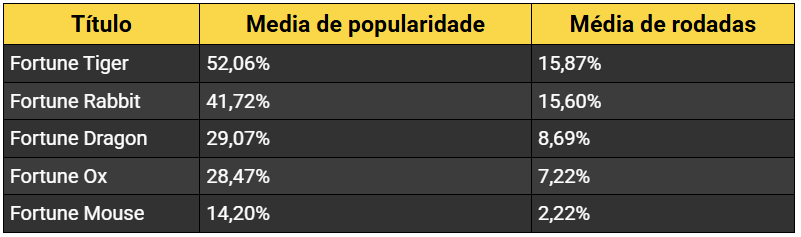 Fortune Dragon, Fortune Ox e Fortune Mouse apresentam consistência em métricas importantes como engajamento, volume de giros e tempo médio de sessão — mesmo com menor popularidade absoluta.